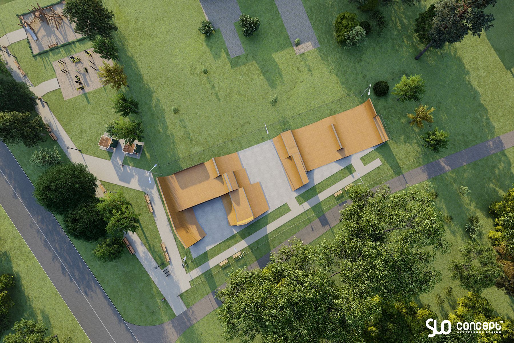 Die Platte ist 44m x 17m groß. Der Skatepark hat einen fliegenden Charakter, d.h. er wird zum Erlernen von vertikalen Sprungtricks genutzt. Er wurde mit Blick auf die zukünftigen Vertreter unseres Landes bei den Olympischen Spielen vorbereitet. Darüber hinaus wurde das nahe gelegene Skateparkgelände durch Ruhezonen mit Bänken, Körben und anderen kleinen Bögen bereichert.