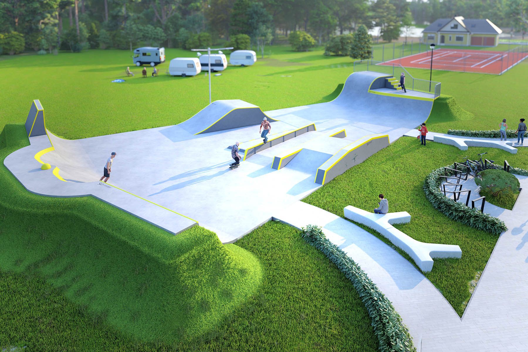 Concept of a skatepark in the city of Więcbork with a total area of 412m2 of the main slab of a typical skatepark and about 257m2 in the form of alleys and accesses.